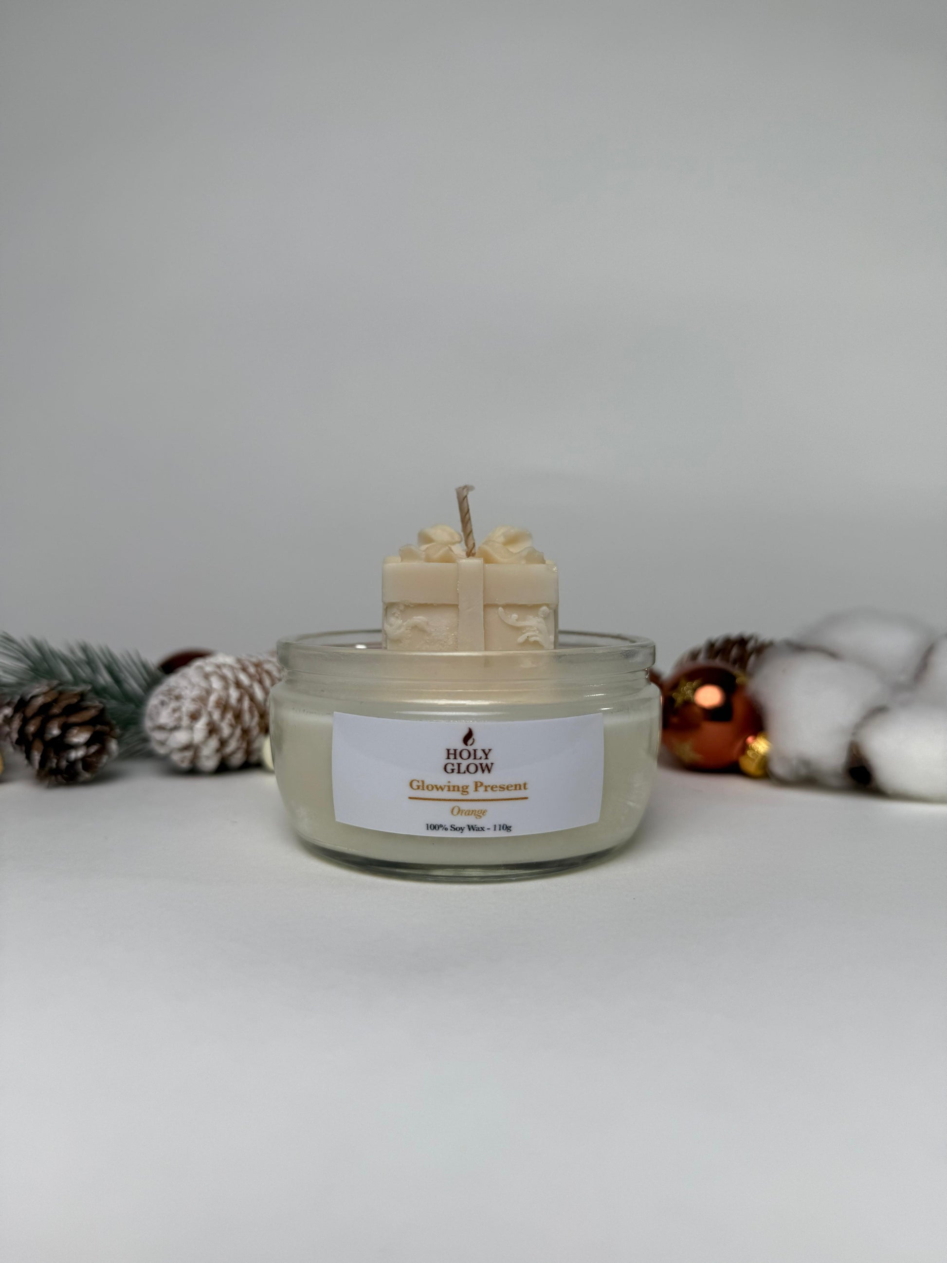 Unsere Glowing Present Duftkerze verzaubert dein Zuhause mit einem frischen, warmen Orangenduft – lebendig, leicht und süß, zum Wohlfühlen.